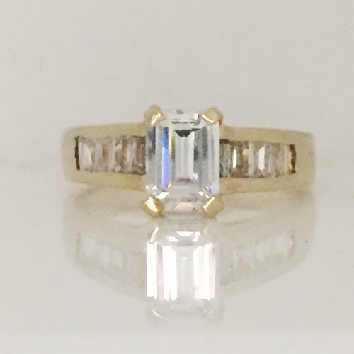 FR2028 9CT YG CLAW SET EMERALD CUT CZ ON CHANNEL SET BAGUETTE CUT CZ SHANK RING 3.5G