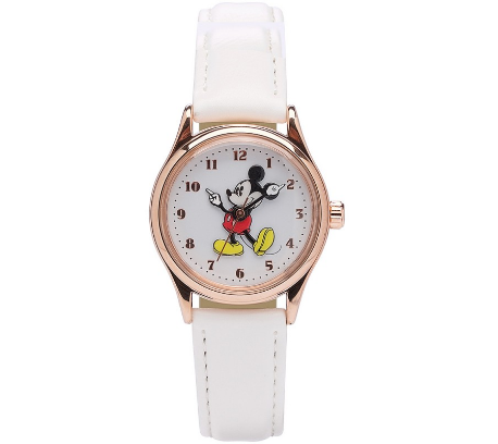 CompareOriginal Mickey Mouse watch with moving Mickey hands and a raised 2D Mickey on the dial. Finished with a white strap and Rose Gold IP case,this watch is a must have for lovers of Mickey. Case diameter 34mm.